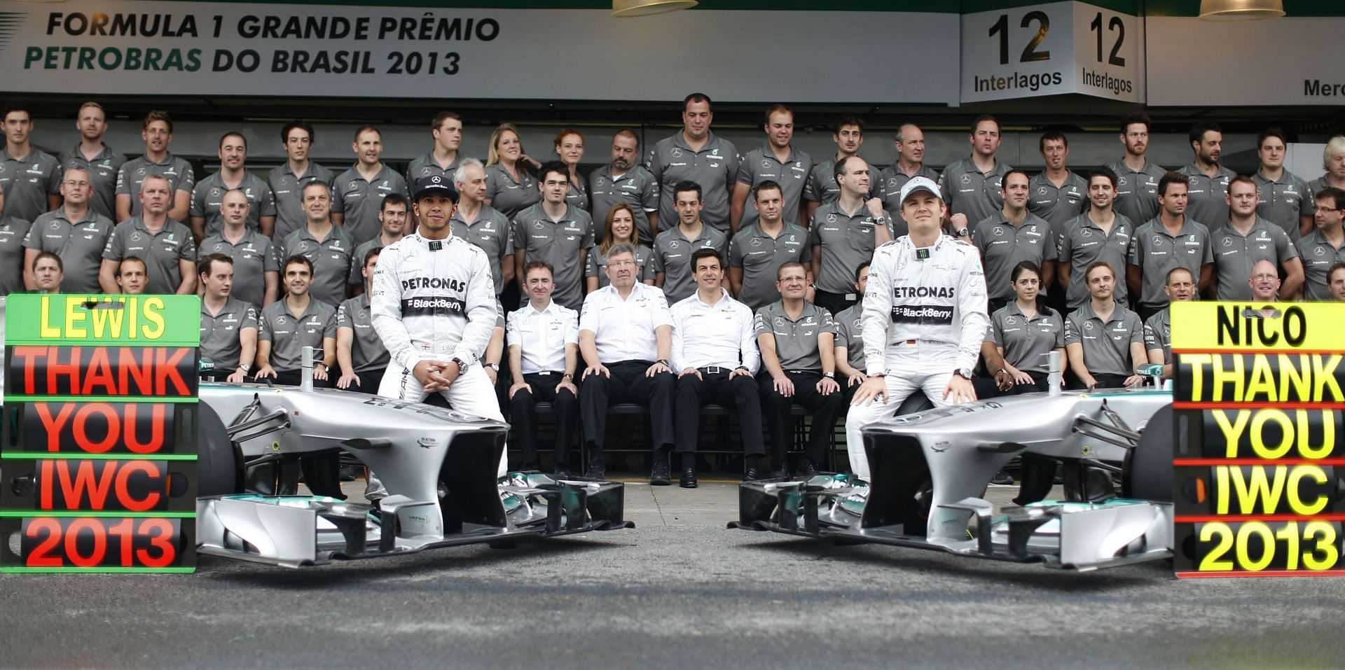 Lewis Hamilton (L) and Nico Rosberg (R) with the rest of the Mercedes F1 team at the FIA Formula One World Championship 2013 Grand Prix of Brazil - Source: Getty