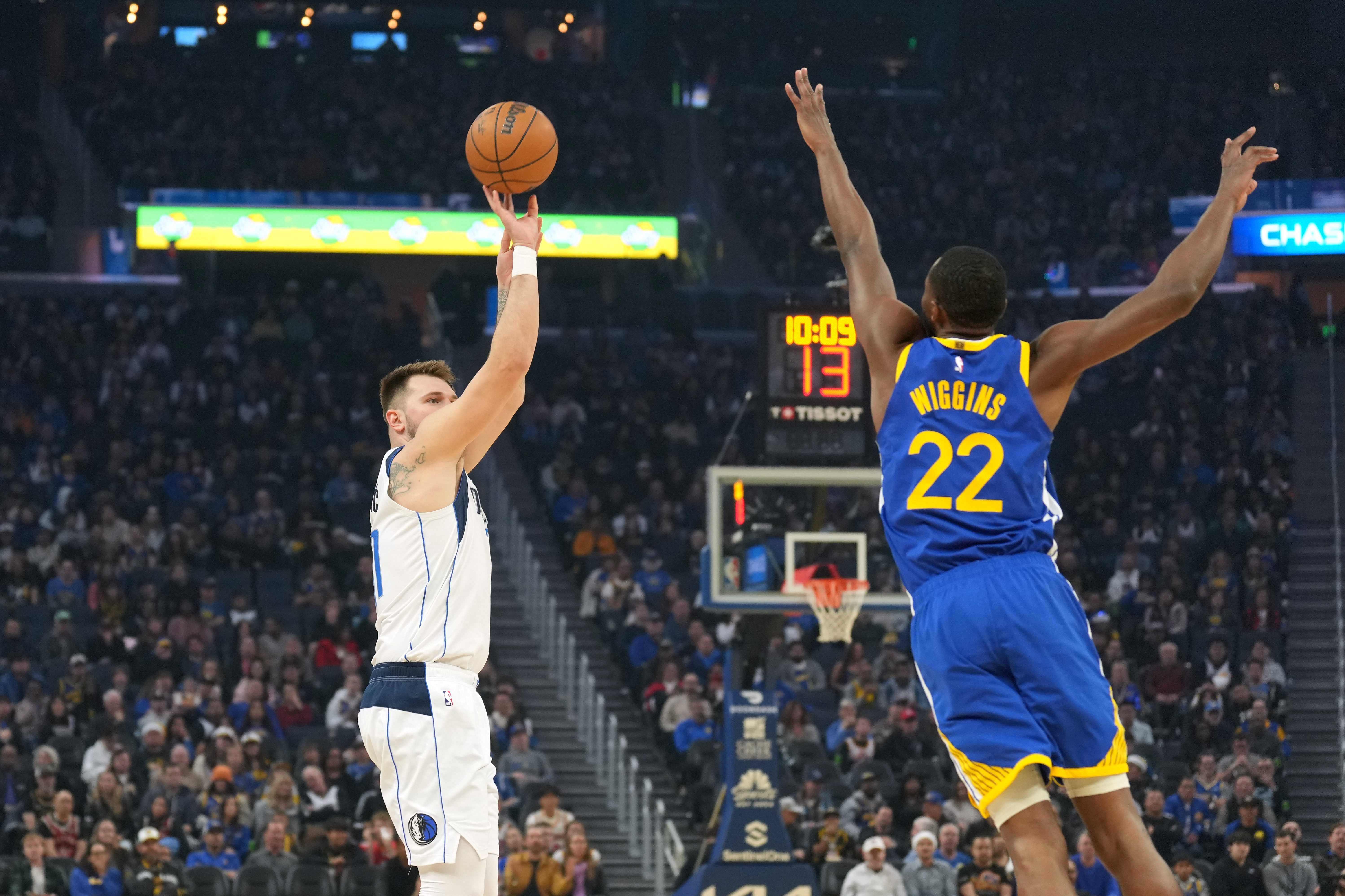 Dec 15, 2024; San Francisco, California, USA; Dallas Mavericks guard Luka Doncic (left) shoots against Golden State Warriors forward Andrew Wiggins (22) during the first quarter at Chase Center. Mandatory Credit: Darren Yamashita-Imagn Images - Source: Imagn