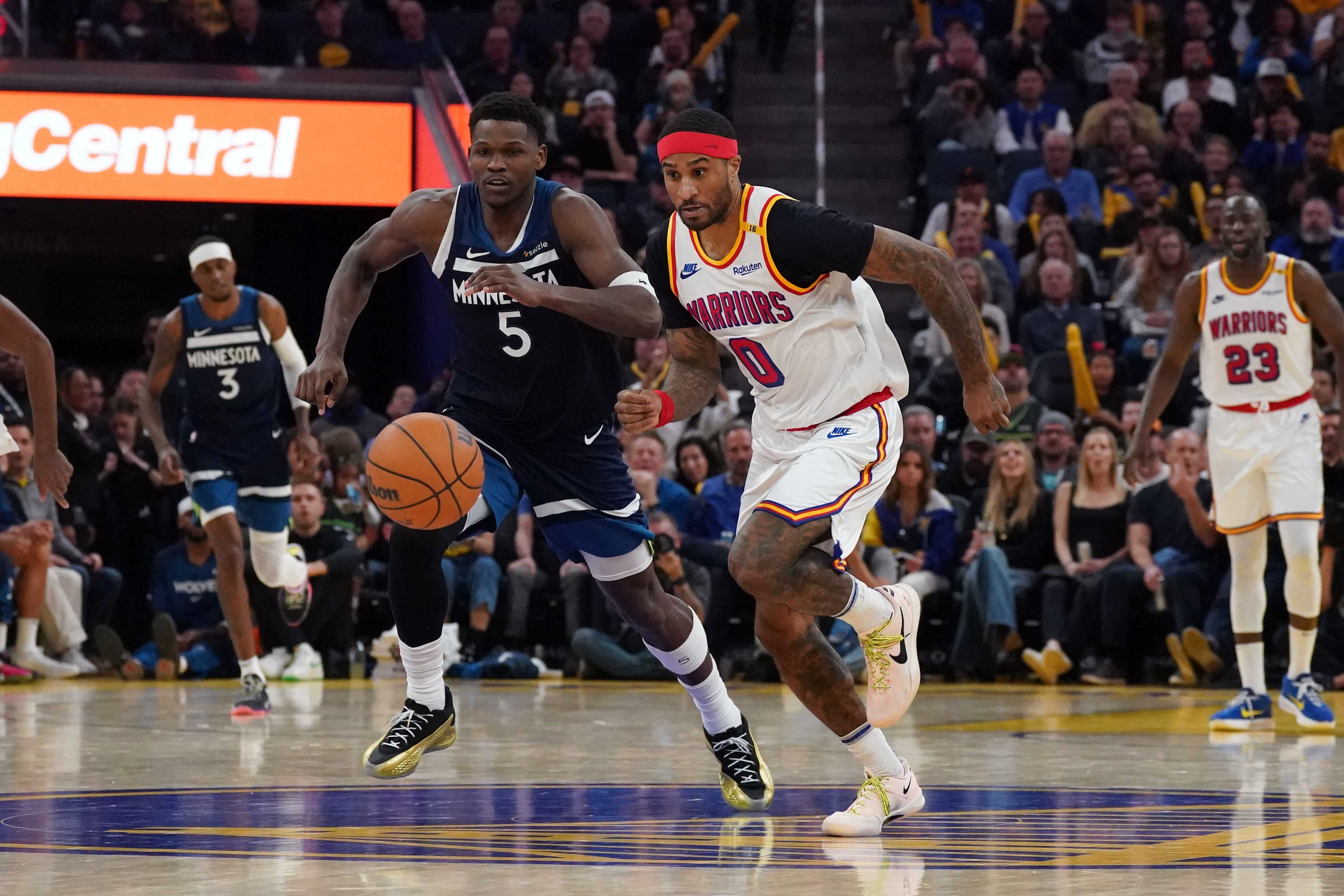 Dec 8, 2024; San Francisco, California, USA; Minnesota Timberwolves guard Anthony Edwards (5) and Golden State Warriors guard Gary Payton II (0) chase a loose ball in the fourth period at Chase Center. Mandatory Credit: David Gonzales-Imagn Images - Source: Imagn