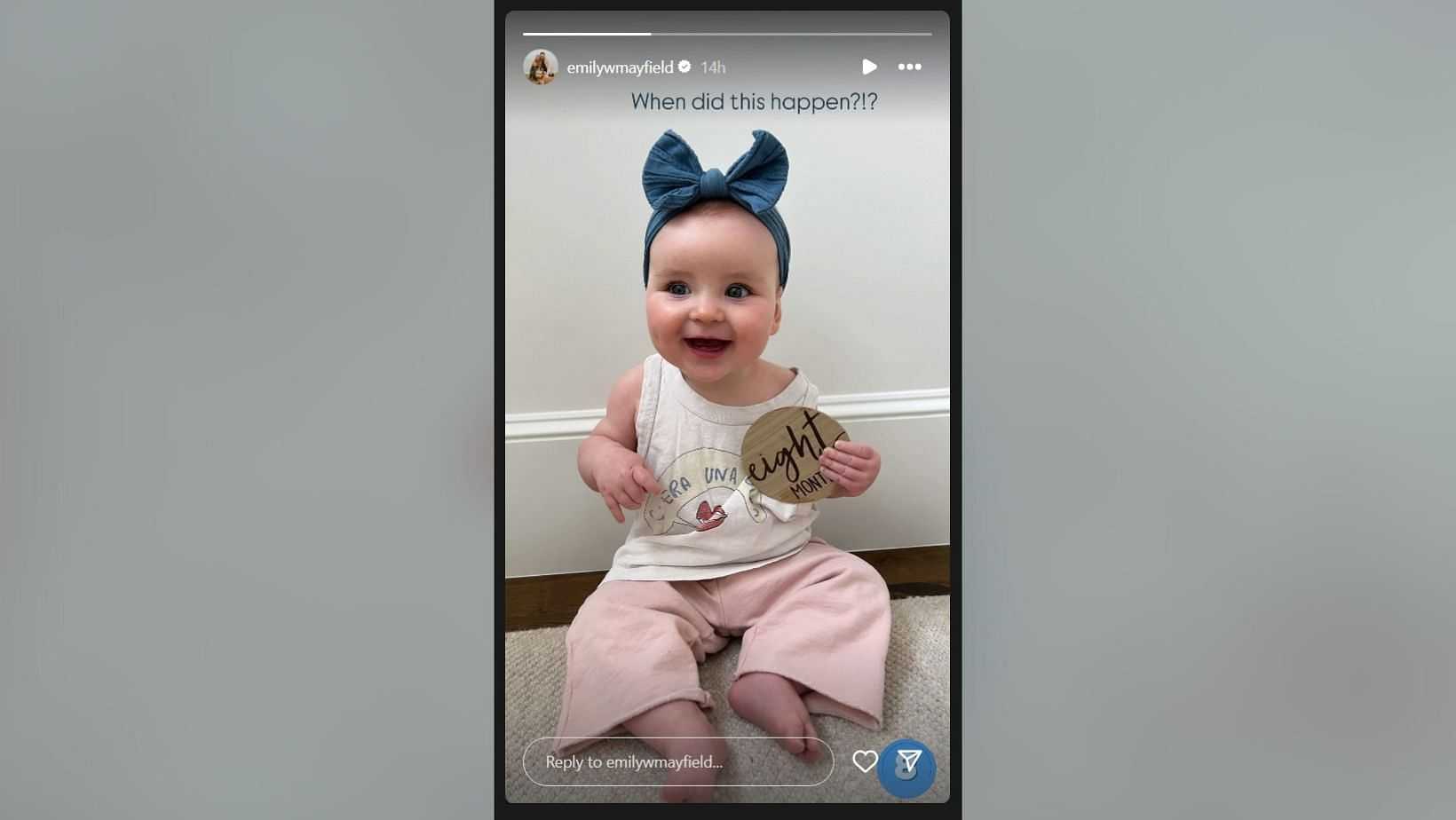 On Wednesday, Emily Mayfield posted a picture of her daughter. In the snapshot, Kova held a wooden plate with "eight months" written on it. Expressing her surprise, Emily captioned her Instagram story:
