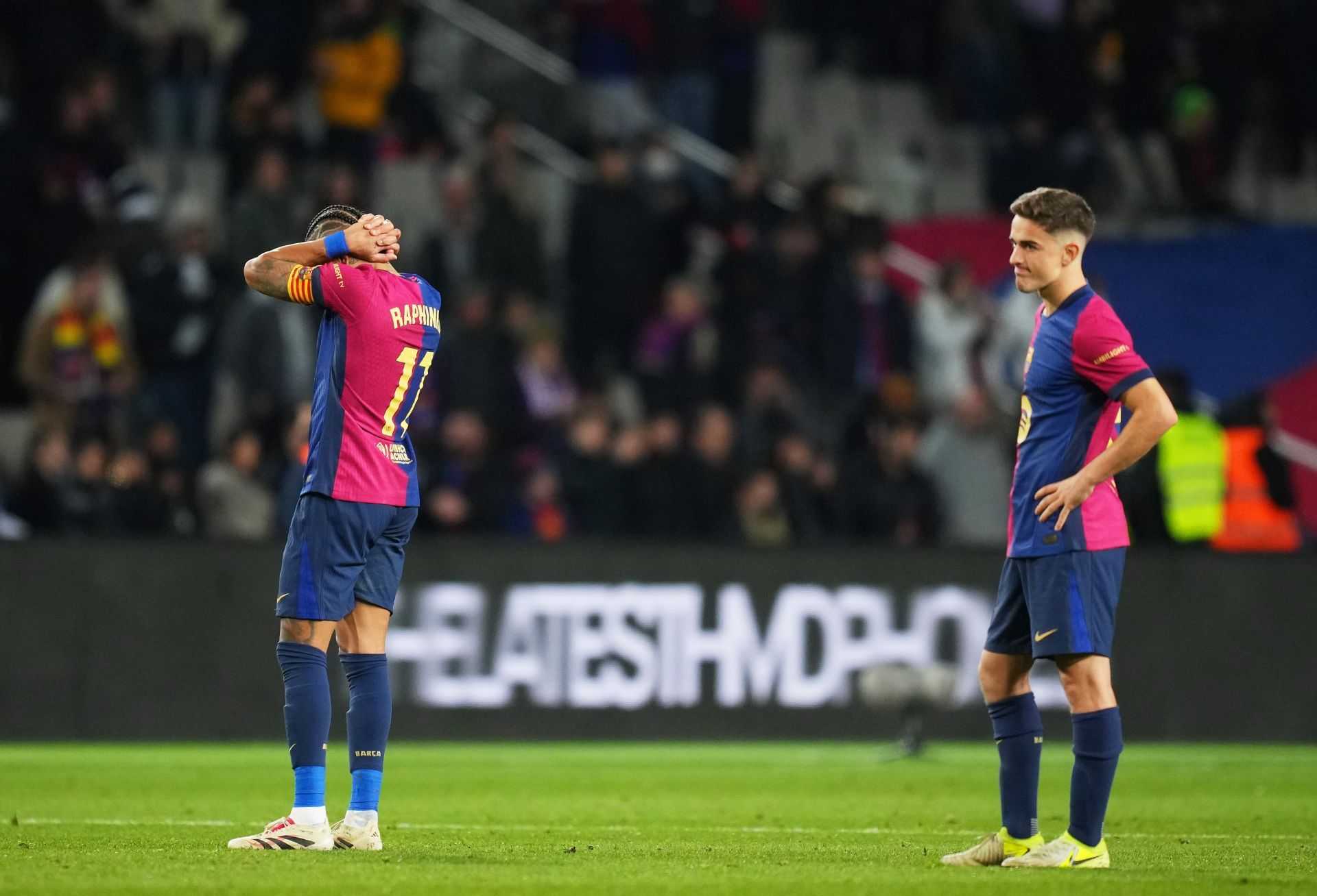 Barcelona players disappointed after conceding a late goal. (Source: Getty)