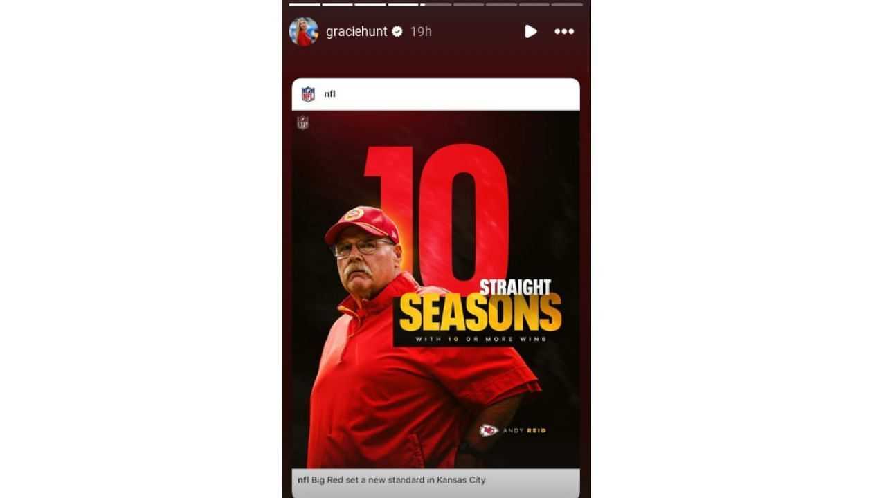 Kansas City Chiefs heiress Gracie Hunt recognizes head coach Andy Reid's pivotal role in the team's success. On Instagram, she reshared the NFL's post honoring Reid for a decade of maintaining a winning record.