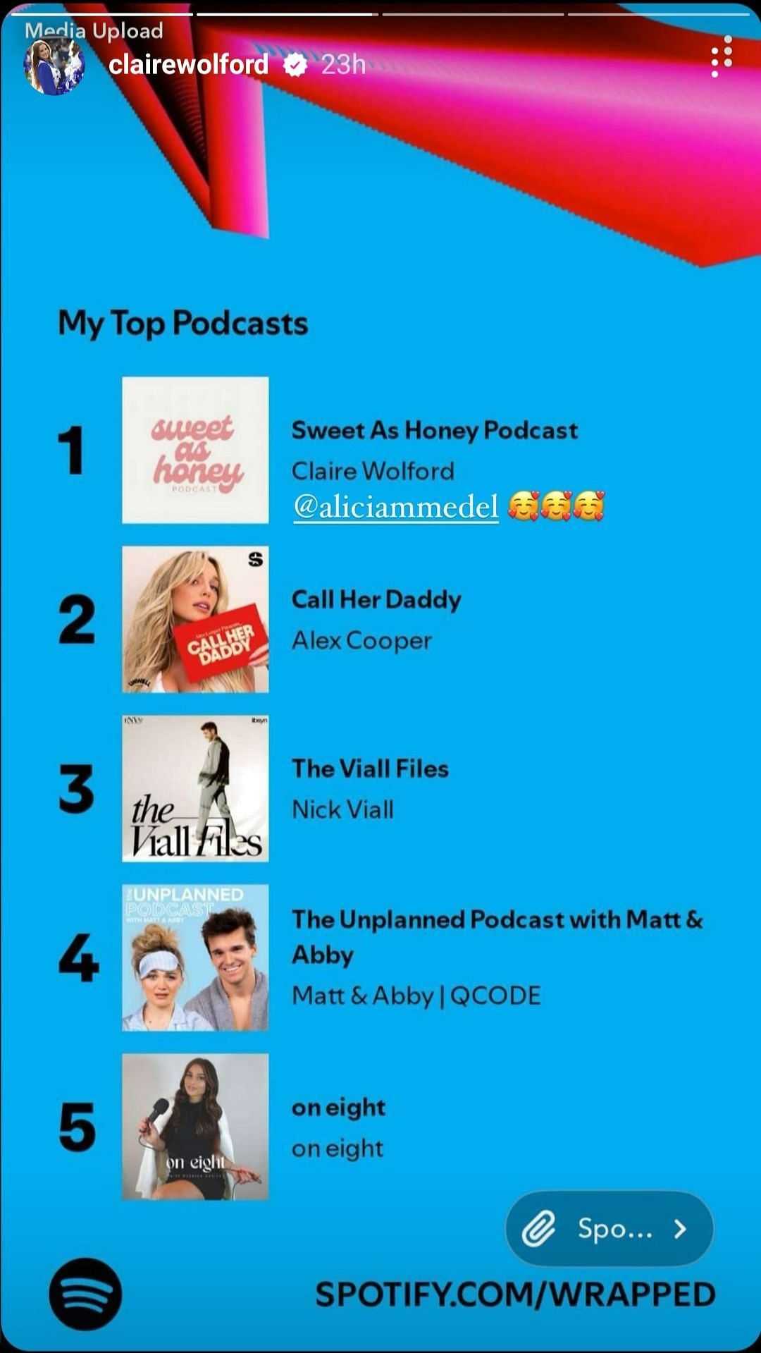 In her most recent Instagram story on Wednesday, Claire revealed the five podcasts on top of her rankings.