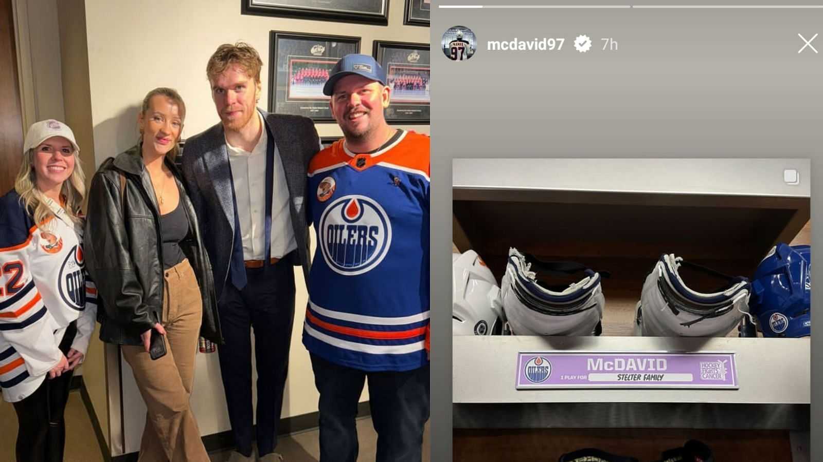 While many named family and friends, McDavid chose the Stelter family in honor of six-year-old Ben Stelter, who passed away in 2022 due to brain cancer. After the game, Connor McDavid and his wife Lauren Kyle reconnected with Ben’s parents and clicked a picture together in the locker room, which both Lauren and the Oilers captain posted on their Instagram stories.