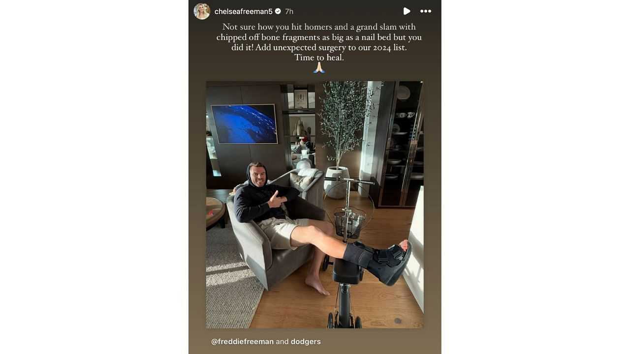 Freddie Freeman's wife Chelsea is going to have to wear multiple hats for a little while. Her husband, the World Series MVP, just underwent successful surgery on his ankle. He sprained it down the stretch of the regular season but didn't miss much time in the playoffs.