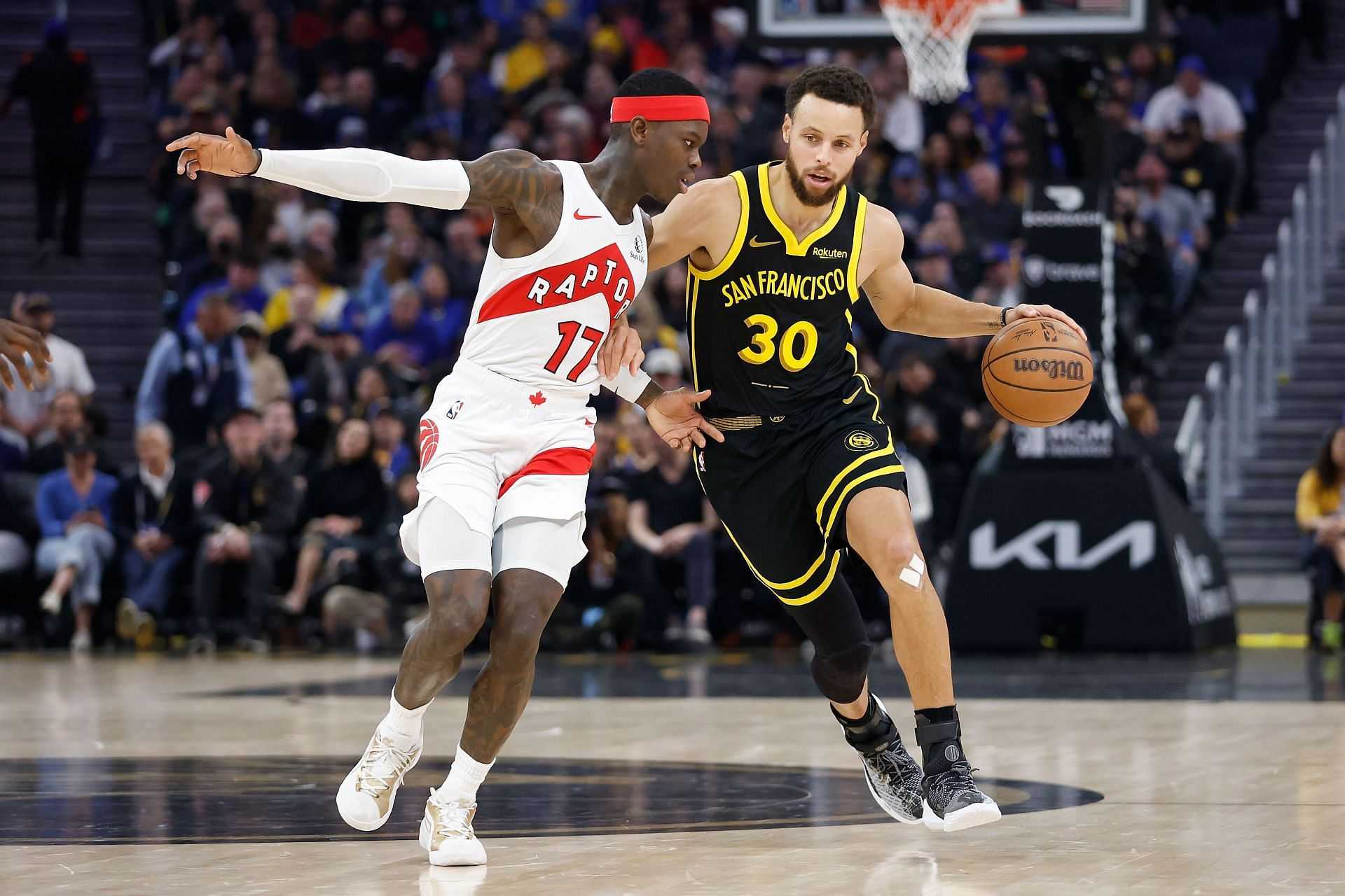 Golden State Warriors' Stephen Curry is guarded by his now-teammate Dennis Schroder. (Image via Getty)