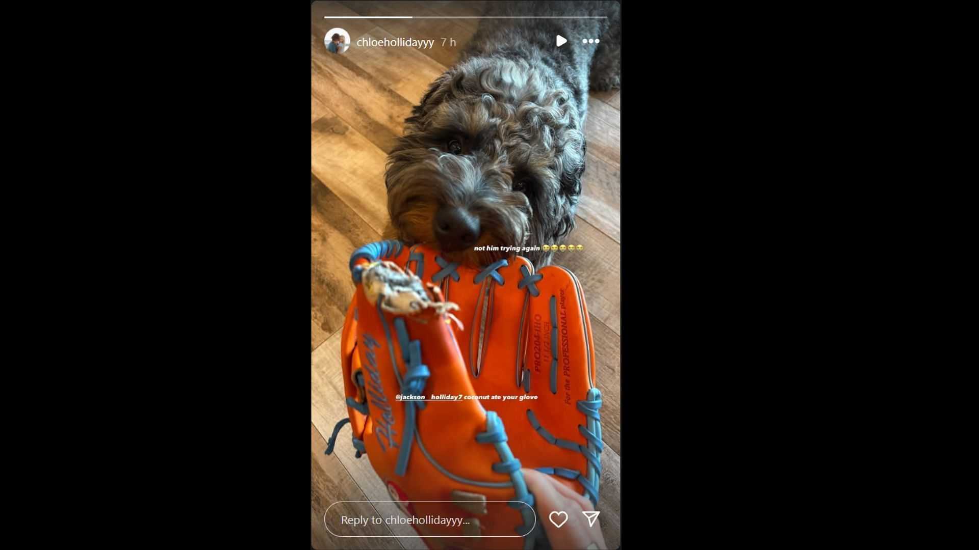 Jackson Holliday's wife Chloe captures adorable moment of pup Coconut munching on Orioles rookie's glove (Source: Instagram/@chloehollidayyy)