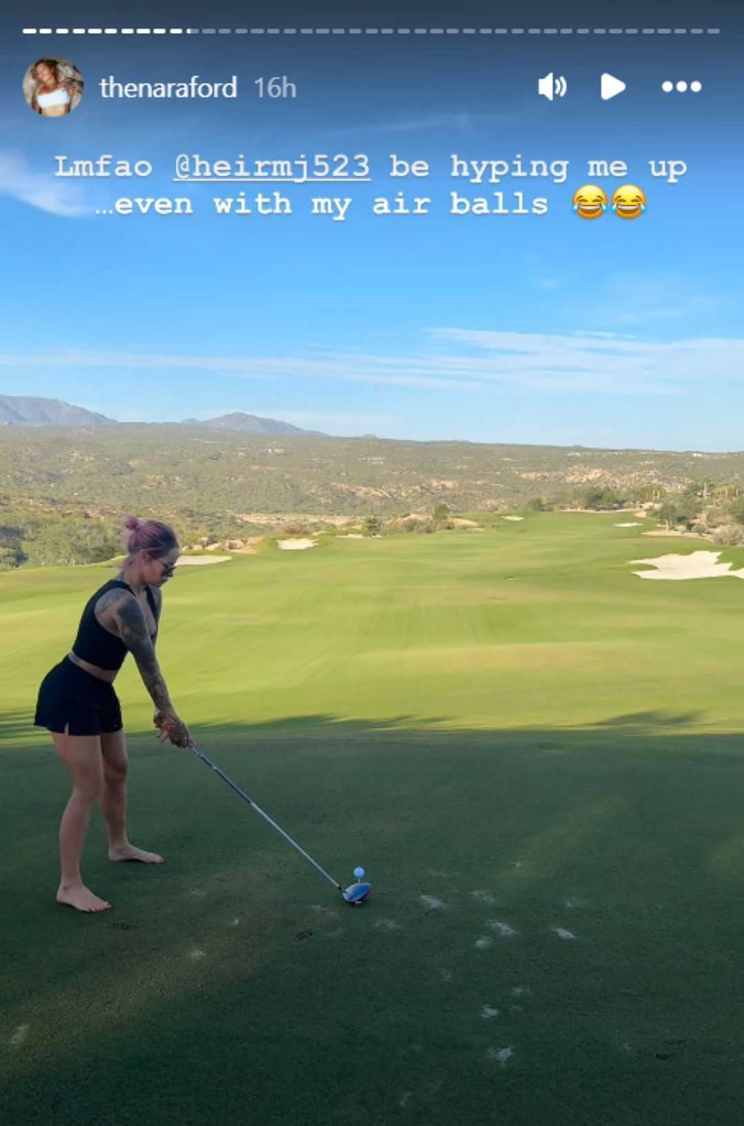 NBA legend Michael Jordan's son, Marcus Jordan, turned cheerleader for Instagram model Nara Ford during their luxe golf outing on Saturday at Chileno Bay Resort & Residences, Auberge Resorts, in Cabo, Mexico. In a story shared by Ford on her Instagram, Marcus was heard cheering for the model as she attempted a shot.