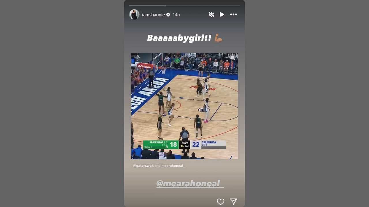 Shaquille O'Neal's ex-wife Shaunie Henderson gave a one-word reaction to her daughter Me'arah O'Neal's incredible block against the Marshall Thundering Herd in an 82-63 victory on Sunday. Henderson shared Florida's post featuring the video of O'Neal's block on her Instagram story.