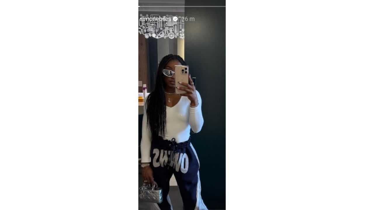 In the mirror selfie, the superstar gymnast effortlessly blended a sporty and chic look. She wore a long-sleeve white top paired with black sweatpants that featured eye-catching “OWENS” across the front.