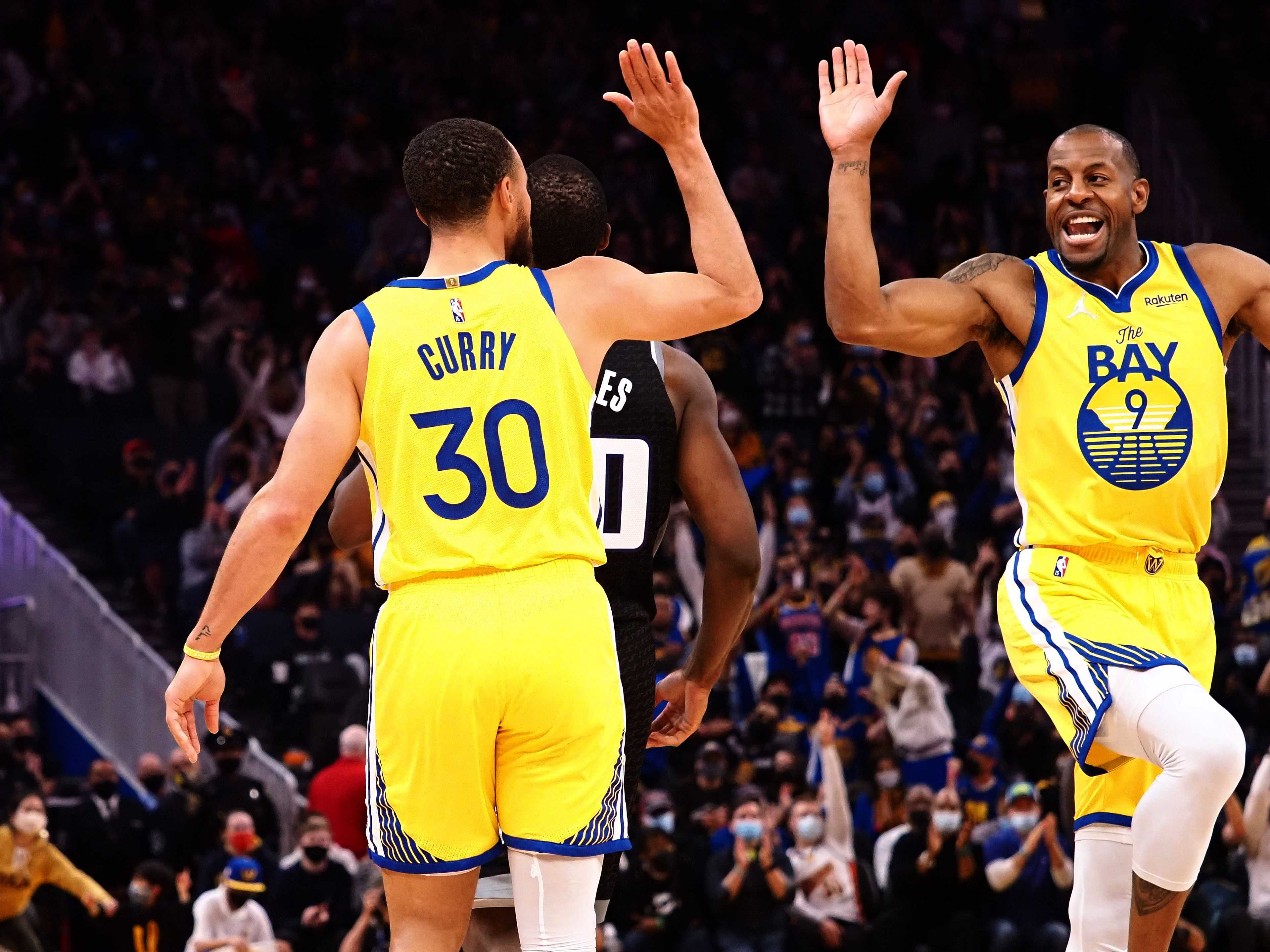Stepen Curry and Andre Iguodala (Image via Imagn).