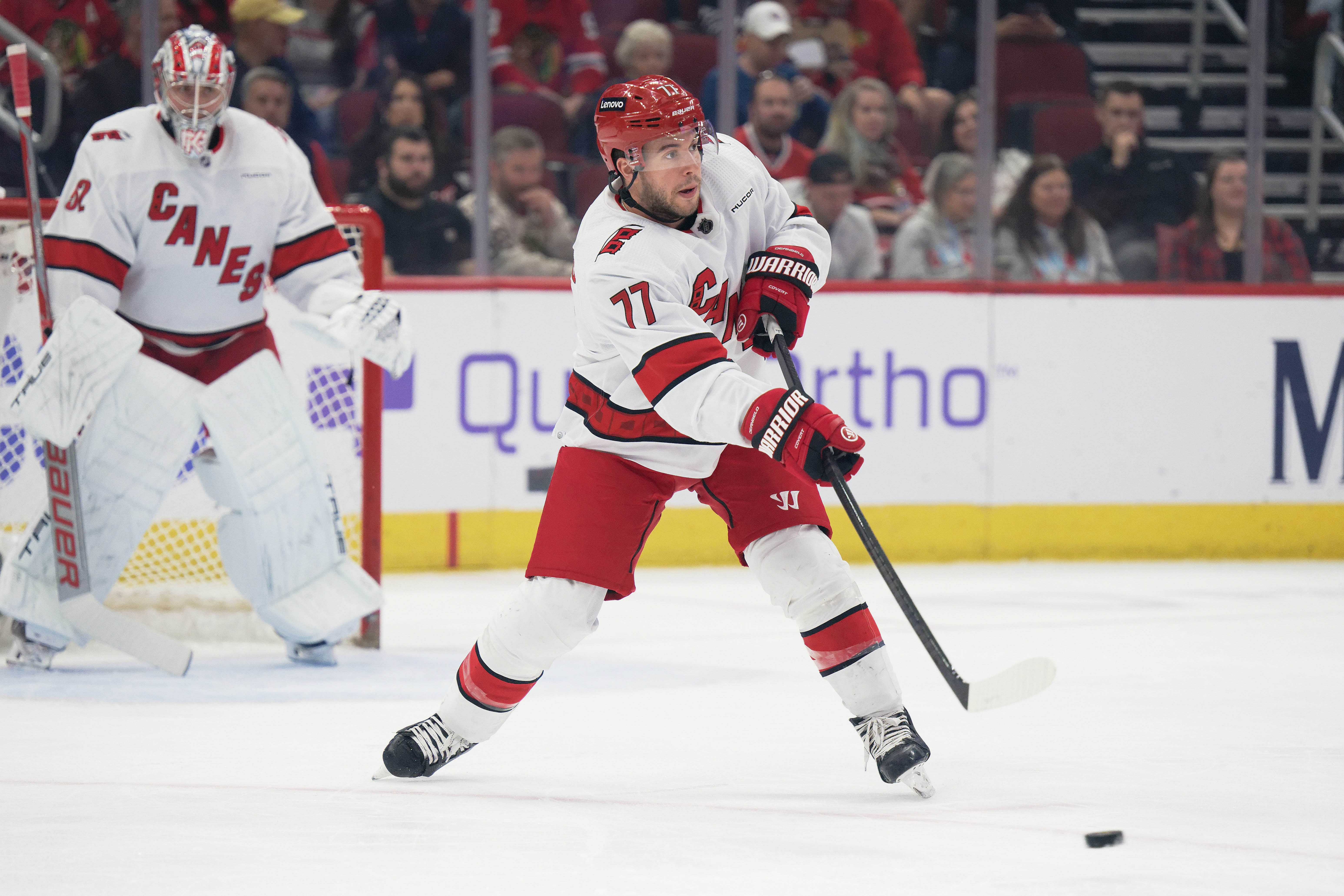 Tony DeAngelo (77) playing for Carolina Hurricanes against the Chicago Blackhawks at United Center. (Credit: IMAGN)