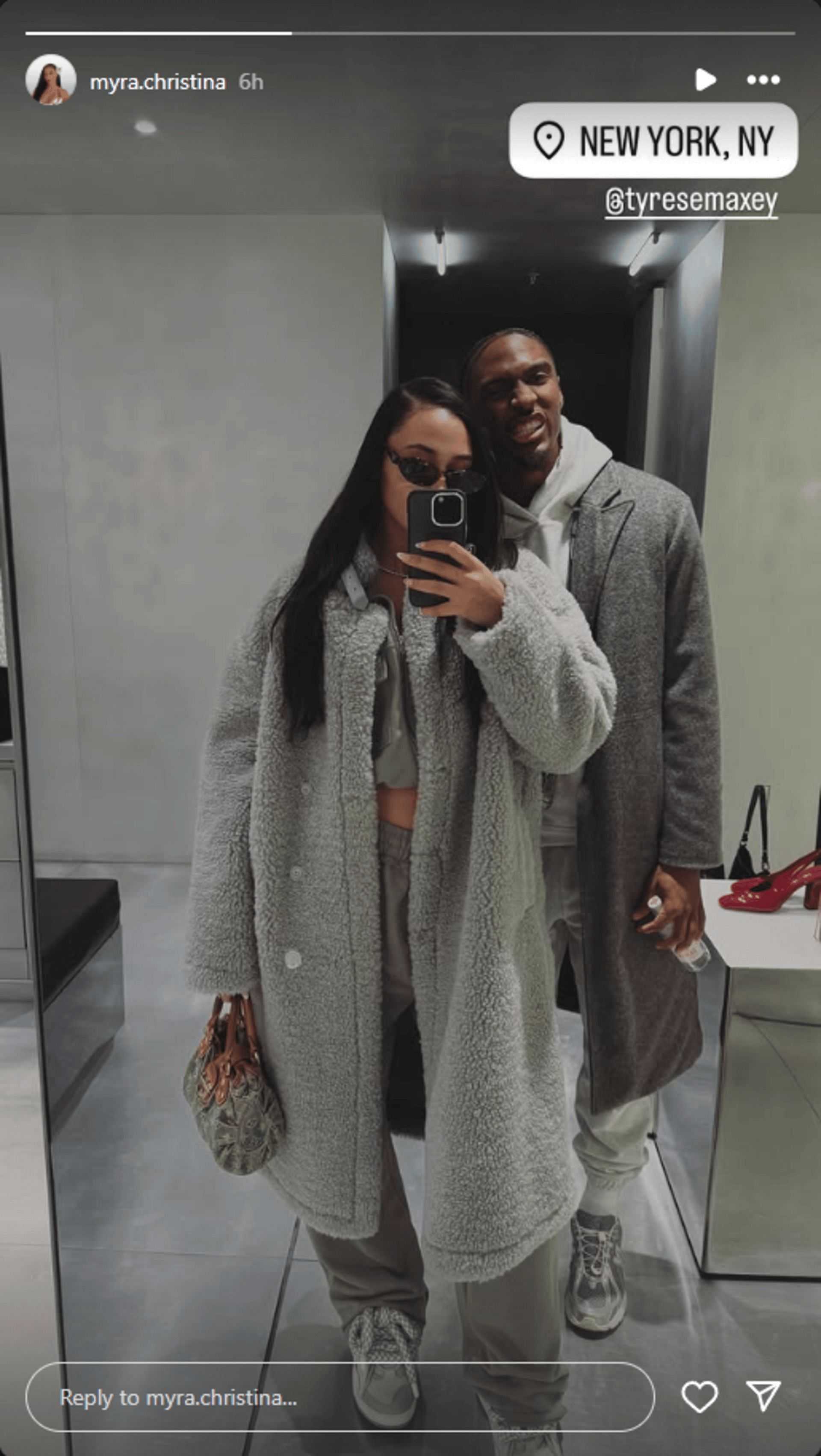 On Monday, Tyrese Maxey's girlfriend Myara Gordon posted an image of them on Instagram. The image was a mirror selfie of the couple wearing matching gray wooly coats in what appears to be an apparel store.