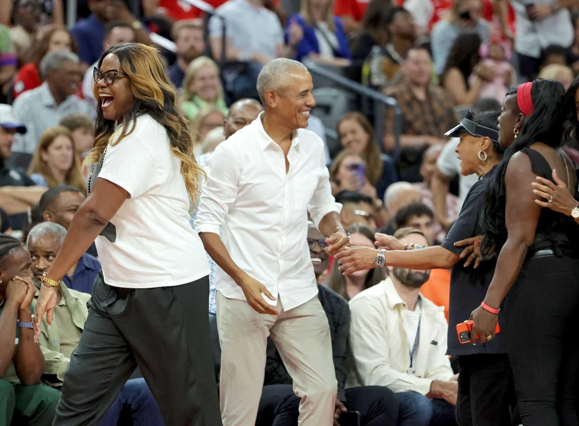 Naismith Memorial Basketball Hall of Fame member Sheryl Swoopes reacts after greeting former U.S. President Barack Obama as head coach Dawn Staley of the South Carolina Gamecocks walks over to him during a ceremony introducing former Olympians on July 10, 2024 in Las Vegas, Nevada. Photo: Getty